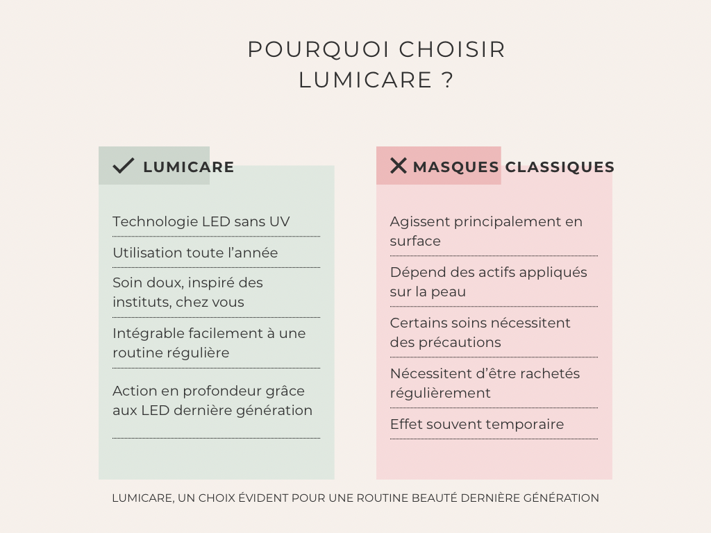 Contrairement à un masque classique, LumiCare est un soin non invasif et sans UV, conçu pour respecter et protéger votre peau.